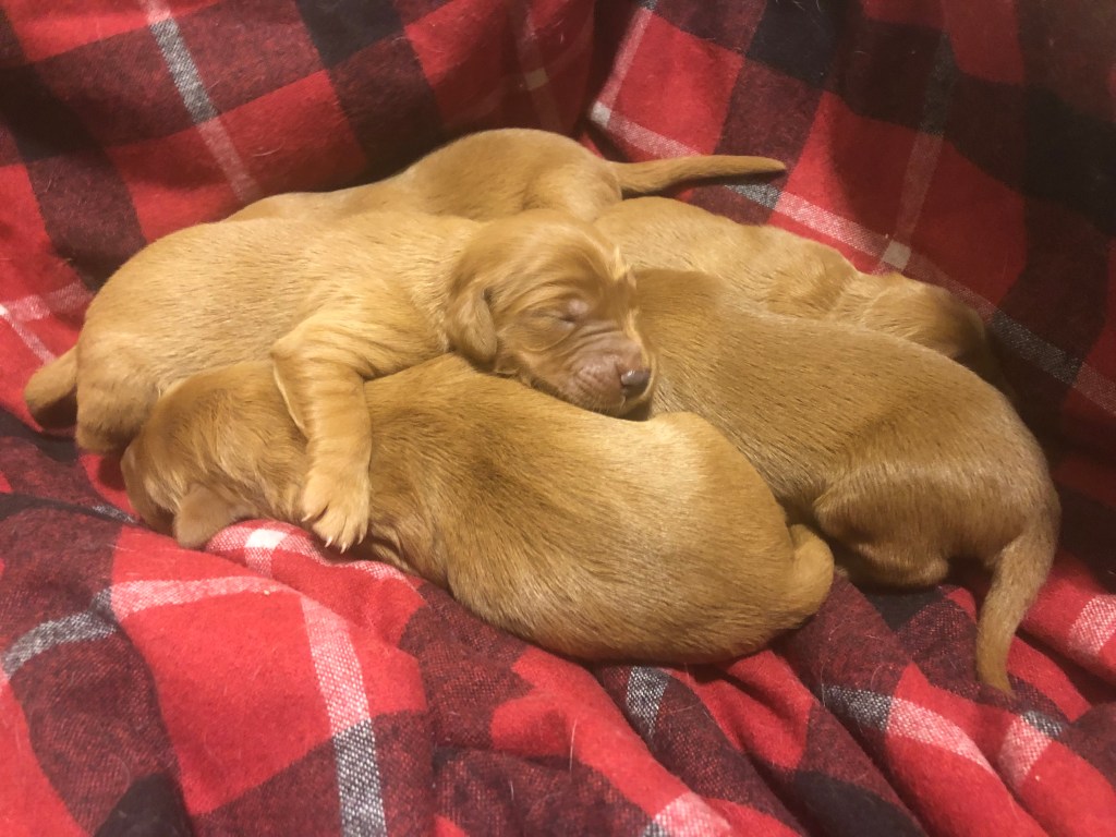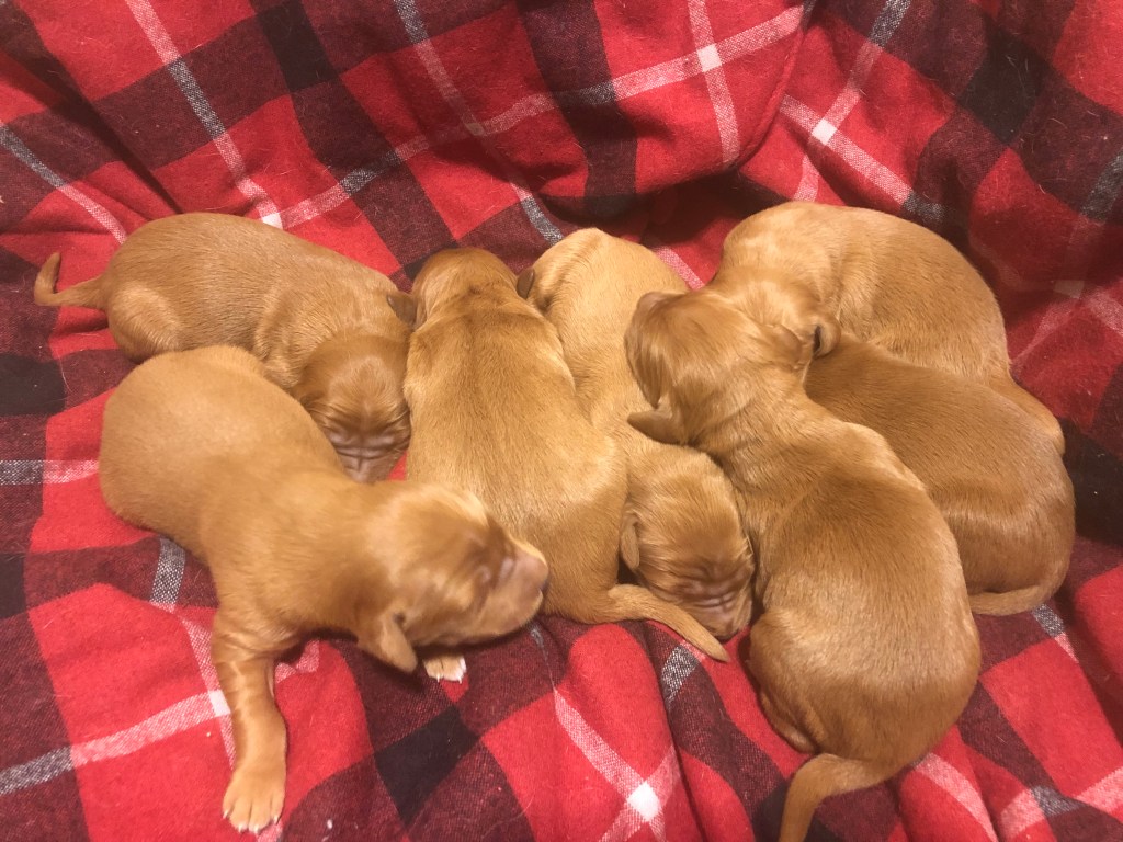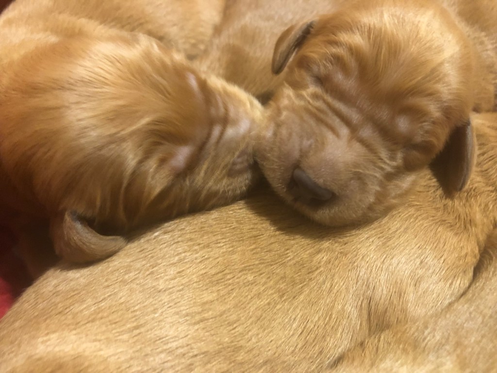 We are excited to announce that seven adorable Golden Irishes joined our household in the wee hours of November 14th! Five handsome boys and two sweet girls are available for adoption and will be ready for their new homes the first week in January, after the busyness of the holidays.