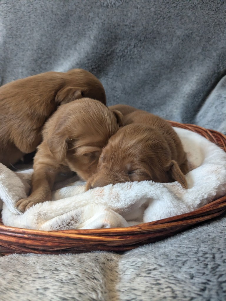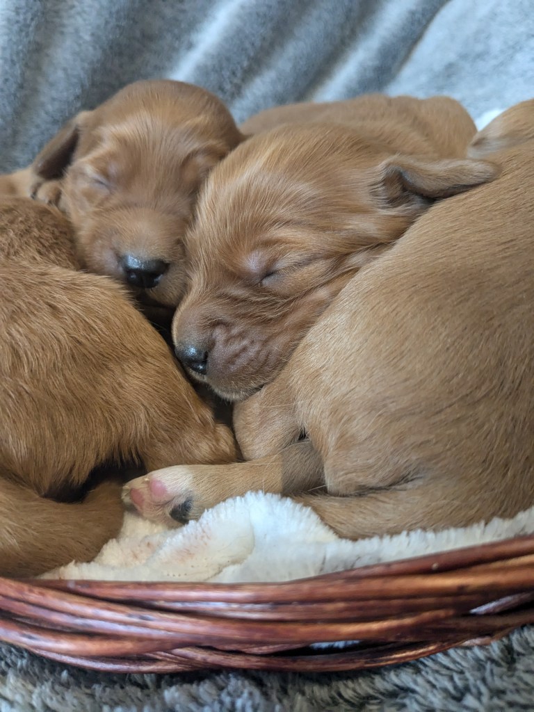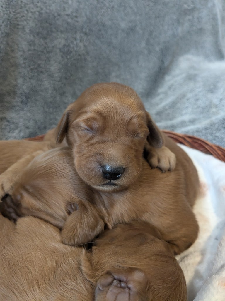 We have love our Ronan/Rosa pairing. They are more compact dogs size-wise, and both parents carry a “lighter shedding” gene according to their DNA testing! These healthy, happy pups arrived March 19 and will be ready for their homes Mid-May!