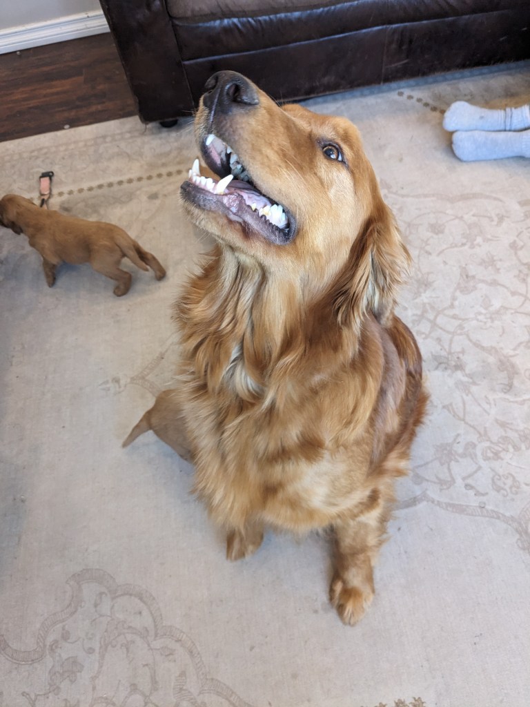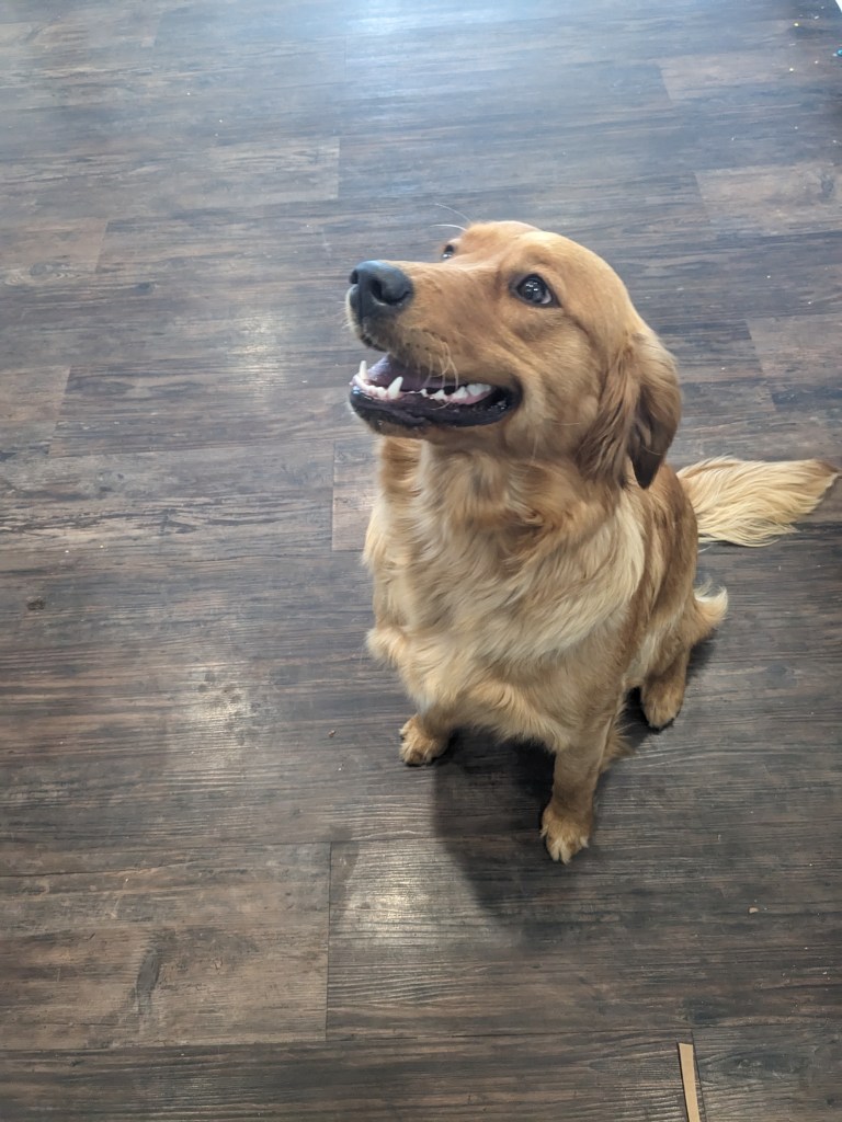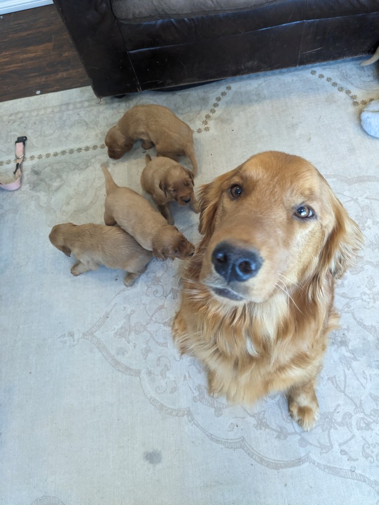 Rosa: A beautiful red Golden Retriever with lighter feathering. She has a loving and playful disposition, loves people, swimming and playing fetch. We are excited to add Rosa to our breeding program as she carries the “low shedding” gene!